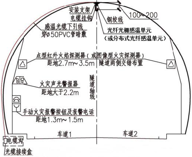 分布式光纖線型感溫火災(zāi)探測器(或光纖光柵線型感溫火災(zāi)探測器)應(yīng)設(shè)置在車道頂部距頂棚100mm~200mm,光纖光柵線型感溫火災(zāi)探測器的光柵間距不應(yīng)大于10m;每根分布式光纖線型感溫火災(zāi)探測器和光纖光柵線型感溫火災(zāi)探測器保護(hù)車道的數(shù)量不應(yīng)超過2 條;探測范圍要求整個(gè)隧道全部覆蓋無探測盲區(qū)。