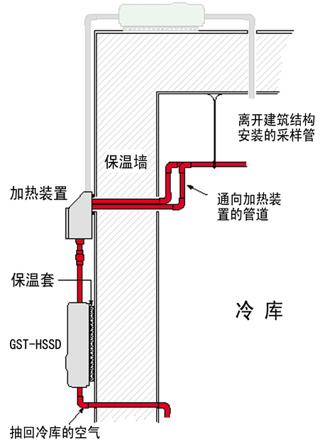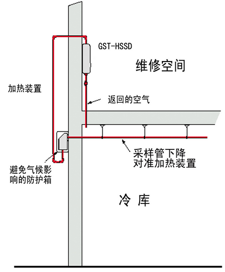 冷庫中采樣管,加熱箱和吸氣式感煙火災探測器的相對位置