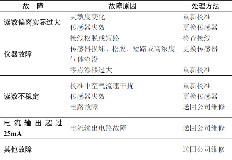 上面的一張表格已經將很常見的故障及處理方法介紹了一下,希望能在大家遇到有毒氣體探測器出現故障的情況時,這張表幫助大家。